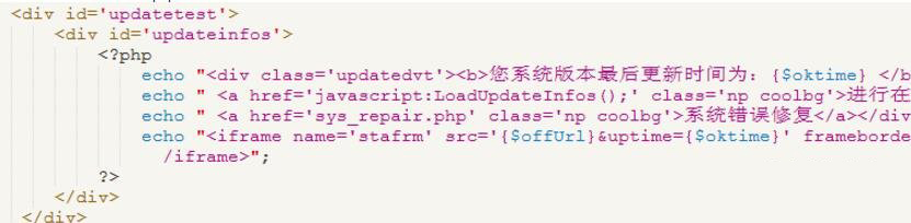 接下来向下看,我们看到<?php echo $cfg_soft_enname; ?> 更新消息,这与后台界面上面的“DedeCMS更新消息”是不是一个东西呢?答案是肯定的,只不过在模板里面,DedeCMS 用<?php echo $cfg_soft_enname; ?>来代替了,为什么要代替呢?因为,<?php echo $cfg_soft_enname; ?>是动态变化的,也就是他代表了一个软件名称,你可以叫Dedecms,可以叫Bebecms,随便起,所以,这里用了一段php代码来动态显示。