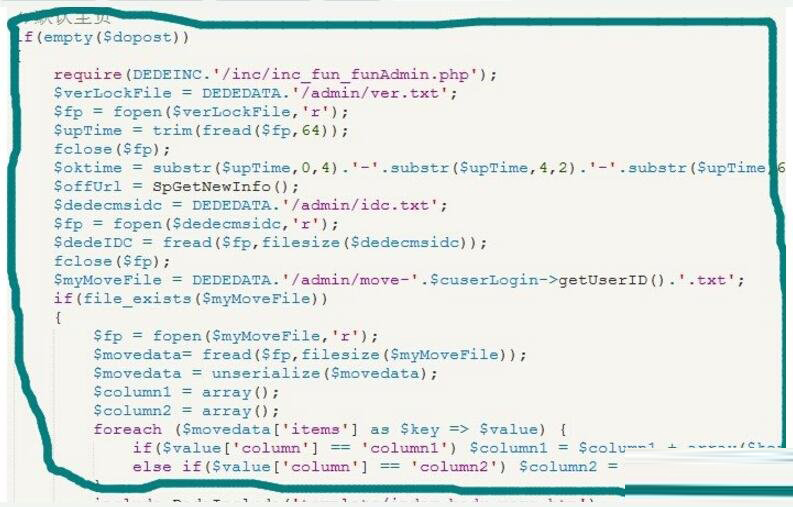 织梦用了一个if语句来判断引入哪个文件,一般织梦默认是引用templets/index_body.htm这个模板的,除非以move-开头的txt文件存在,而这个文件一般不存在的,若存在就引入模板templets/index_body_move.htm,用方框框起来的是引入必要的php文件,初始化和判断等,这里不作多解释。