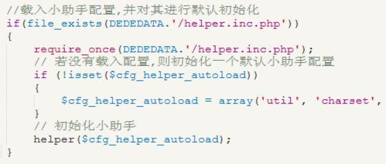 首页要在入口文件common.inc.php里面进行初始化(这里的初始化与上面的提到的helper('sum')初始化不一样,这里指的是引入helper.inc.php并根据里面的数组创建程序文件)织梦小助手,若文件helper.inc.php存在,则把里面的数组$cfg_helper_autoload,通过helper($cfg_helper_autoload)初始化(这里跟上面提到的初始化一样),若没有这个文件,而用默认的。