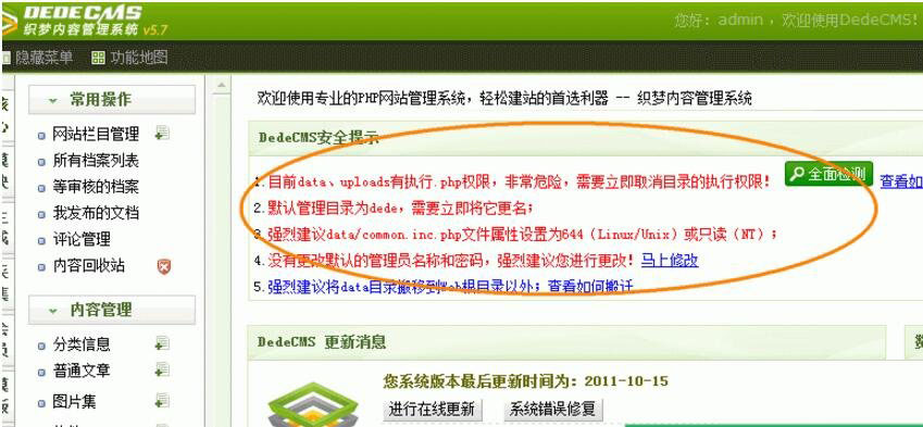 当我们安装好织梦dedecms 后,进入后台,会看到这样的提示,如图: