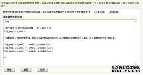 后台-系统-随机模板设置,开启方法$cfg_tamplate_rand=1;如果不想使用此功能,把$cfg_tamplate_rand=0即可,系统默认关闭状态