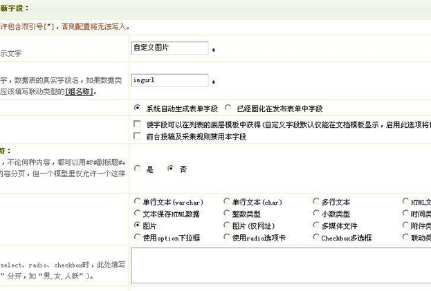 进入网站后台,点击[核心]——[内容模型管理],点击“普通文章”的“更改”按钮,进入编辑界面,切换到“字段管理”选项,点击“添加新字段”,如图: