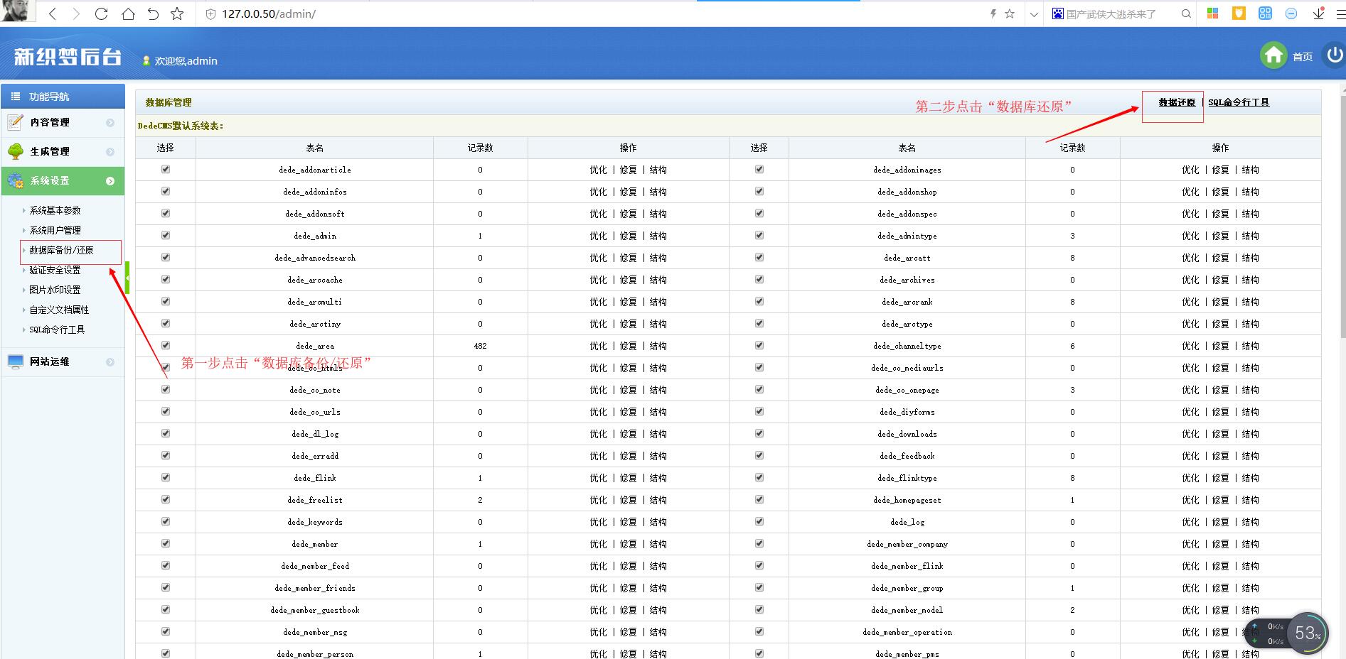 4.进入后台,点击“系统”-“数据库备份/还原",执行“数据还原”即可。