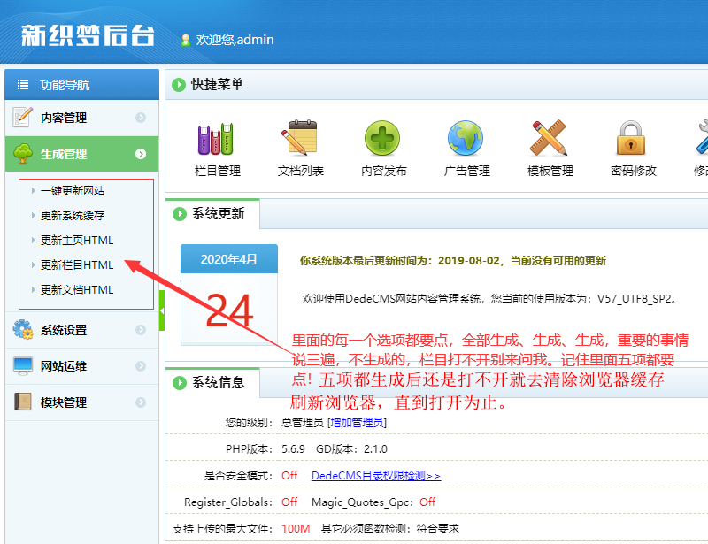 (注):到这一步网站就基本安装完成了,到这一步只要后台点击“生成”按钮,把上图的五项从上往下全部生成过就可以了!