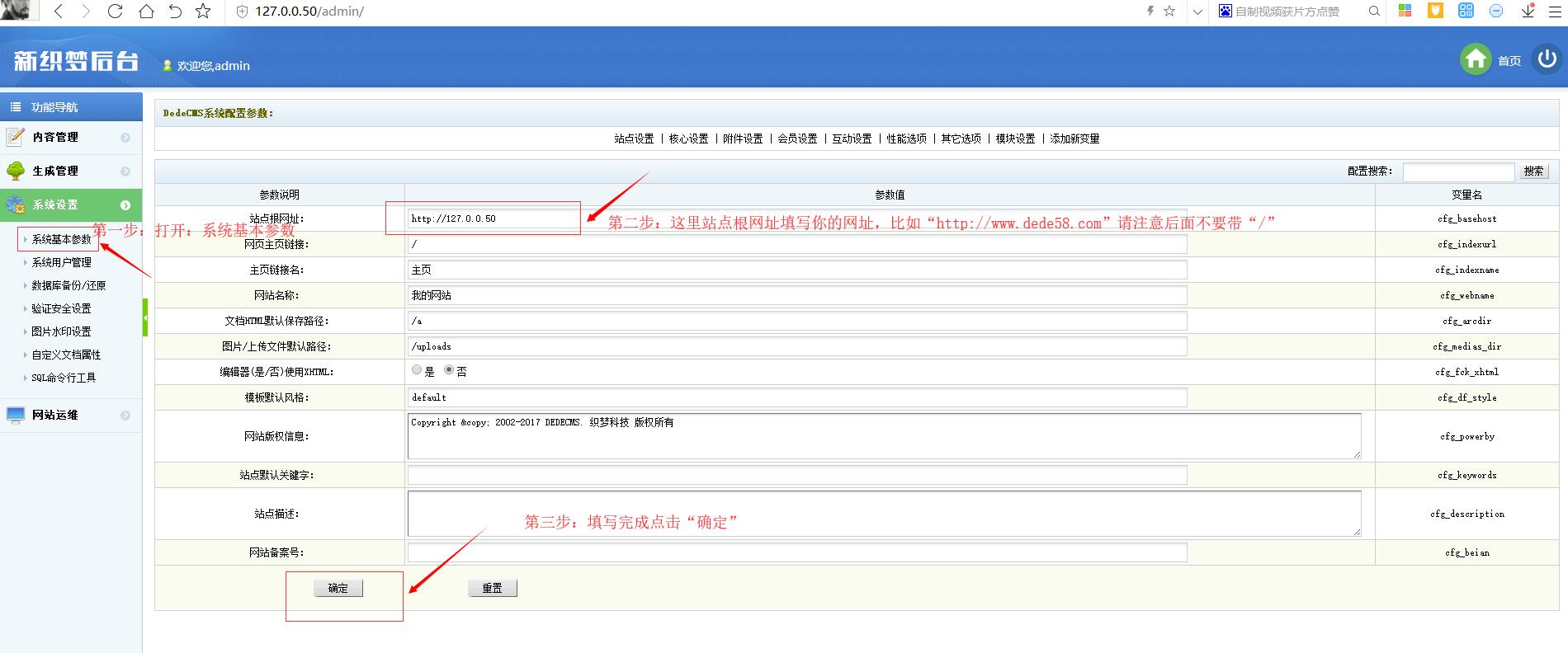 4.进 系统—系统基本参数—填好你的根网址 。。记住后面别加 / 和其他的参数。