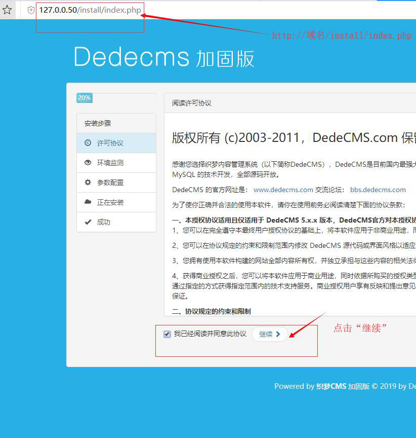 1.运行 http://域名/install/index.php(比如你的域名是:http://www.dede58.com/,就输入http://www.dede58.com/install/index.php)