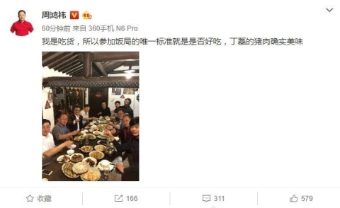 我是吃货,所以参加饭局的唯一尺度就是是否好吃,丁磊的猪肉确实美味 。——360董事长兼CEO周鸿祎