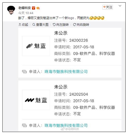 从图中所示,名为“珠海市魅族科技公司”的申请人,在 5 月 18 日就注册了两种软件产品、科学仪器的logo,一个形似两颗药丸拼接,一个形似海浪。而实际上,后一种样式的logo在本年上半年魅族科技进行公司内存架构调整时,就已经曝光过一次。由此看来,魅蓝手机真将采用其作为产品logo,就是不知网友能否买账了。