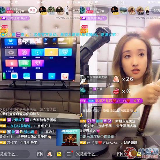 24 日晚 8 点,MOMO与斗鱼上的五位知名直播红人集体“黑幕”上线,在微弱的光线环境中,主播们在带有夜视效果的摄像机前和粉丝神秘互动,引发了百万粉丝的集体猜想。本来,摄像机拍摄到的画面是InFocus富可视 40 英寸电视上直接播罢休机直播的画面。灯光打开的瞬间,InFocus富可视电视清晰感立即成现在了大家面前。主播们也按耐不住对黑科技的尝试,积极炫“富”,现场和粉丝分享了电视丰富的内容资源,并互动了电视自带的全民K歌功能,在其自带JBL音箱的强大加持下,主播的完美的演唱带来了强烈的现场感。极致的产品体验让主播和参与互动的粉丝们,都忍不住疯狂为InFocus富可视产品进行打call。