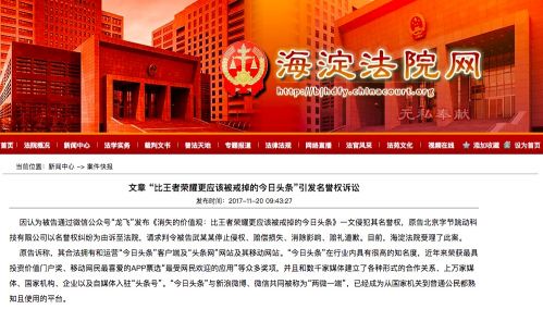 【TechWeb报道】 11 月 20 日消息,据海淀法院网消息,因认为自媒体“龙飞”所发布的一篇名为《消失的价值不雅观:比王者荣耀更应该被戒掉的今日头条》的文章侵犯其名誉权,北京字节跳动科技有限公司以名誉权纠纷为由诉至法院,请求判令被告武某某停止侵权、补偿损失、消除影响、赔礼报歉。目前,海淀法院受理了此案。