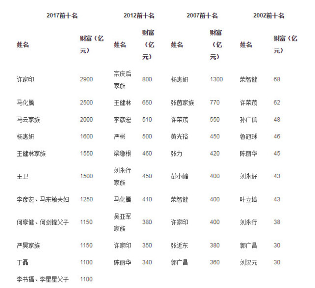 胡润研究院今日发布《胡润百富榜2017》(注:上榜富豪财富计算的截止日期为本年 8 月 15 日),中国恒大许家印( 59 岁)以 2900 亿元的财富拔得头筹。马化腾( 46 岁),马云( 53 岁)及其家族别离以 2500 亿元、 2000 亿元排名2、 3 位,刚好与去年榜单对调。