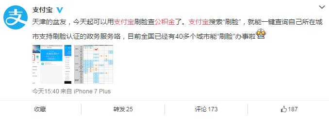 今日支付宝官方微博宣布,“天津的盆友,今天起可以用支付宝刷脸查公积金了。支付宝搜索“刷脸”,就能一键查询自己所在城市支持刷脸认证的政务服务咯,,目前全国已经有 40 多个城市能“刷脸”办事啦”。