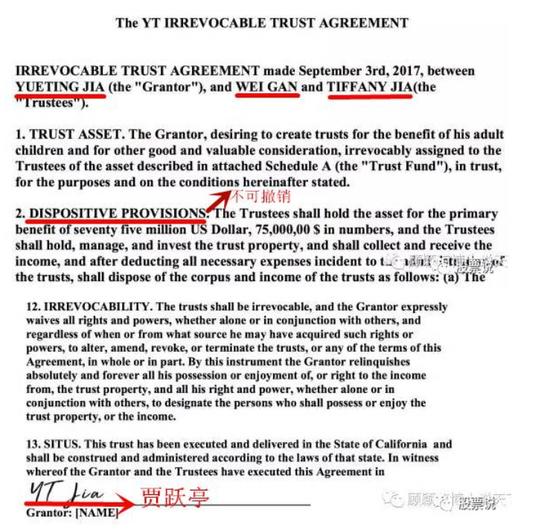 顾颖琼从洛杉矶律师助理手里拿到了贾跃亭的irrevocable living trust 【不成撤销的生前信托】的其中一份草稿文书【信托名字叫THE YT IRREVOCABLE TRUST 】。信托文书上显示,他给Tiffany Jia(贾跃亭其中的一个女儿),留了 7500 万美金,约合五亿人民币。甘薇是信托基金守信委托人。【贾跃亭已经在初始版本上签字,但是之后因为需要加入其他修改,这个版本被作废】他的几个孩子将别离得到了差别的信托基金,金额大概相当。最后的信托基金款项据悉将从法拉第公司的资金池打入。