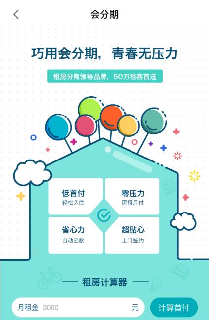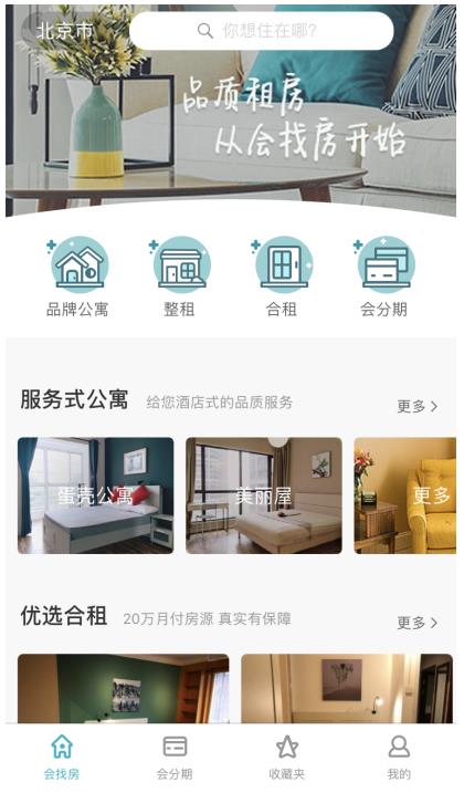 会找房APP界面简洁,品牌公寓、整租、合租三类房源完全满足市面上绝大多数消费者的租房需求。会找房整合了作为房租分期支付手段的会分期功能,该功能对于身处一线城市和强二线城市饱受高额租金困扰的租客来说无疑是一大利好。