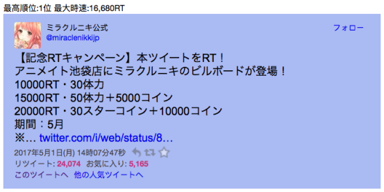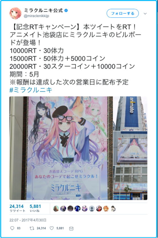 线下线上联动结合,这是面对消费者用户提高推广效果极佳手段。当Animate户外广告打出后,CLICK TECH利用《暖暖》官方Twitter推送了《暖暖华丽“换装”池袋animate》的广告现场画面推送,得到粉丝的疯狂转发,迅速成为当日转推速度最高的话题。利用Twitter开展的这次事件营销,其传播速度之迅疾,参与粉丝之热情,都远远超出预想。