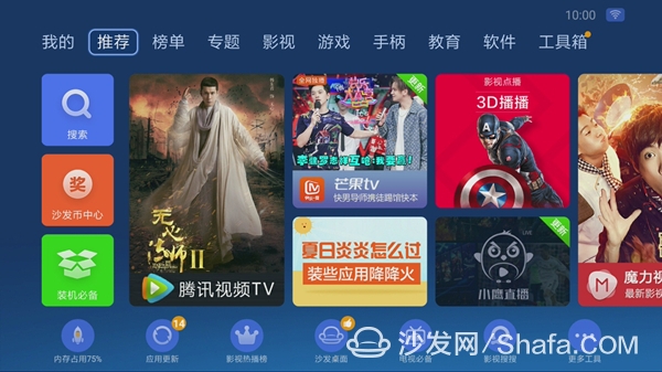 可惜的是,三星虽然有着较高的画质,但是在国内想要不雅观看电视直播,或者是免费的电影点播需要外接一个电视盒子,盒子上安置沙发管家,就可以实现以上功能。