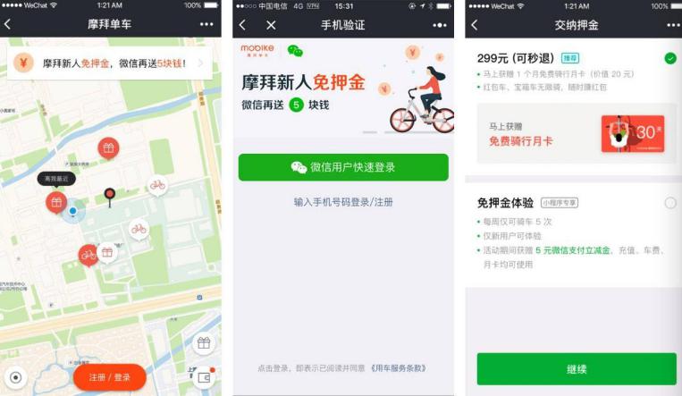在结合小程序的场景下,微信的高覆盖率将使得摩拜的使用成本趋于零,尤其对于一些担忧押金的新用户来说,免下载、免押金的低门槛能够大大提升新用户的尝鲜概率,降低新用户使用摩拜单车的门槛。
