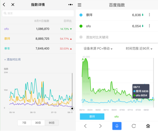 当前ofo发力在改装智能锁,摩拜顿时加大补助力度,对ofo新增用户釜底抽薪。按照近90天微信指数显示,摩拜在微信端一直大幅领先ofo,甚至在8月11日摩拜的品牌词竟超过了“单车”的品类词;别的在近90天的百度指数显示,一直在舆论声量上处于攻势的ofo在8月份被摩拜小幅度反超。