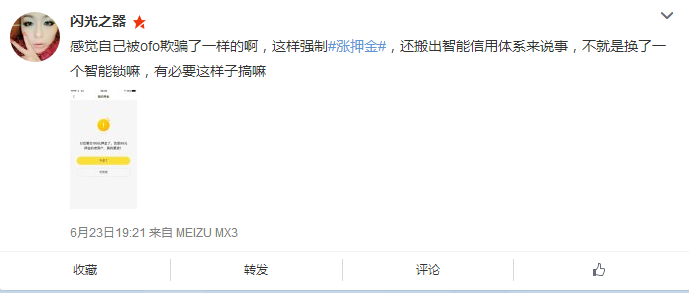 网友们对于涨押金议论纷纷,,“感觉本身被ofo欺骗了一样的啊,这样强制涨押金,还搬出智能信用体系来说事,不就是换了一个智能锁嘛,有须要这样子搞嘛。”