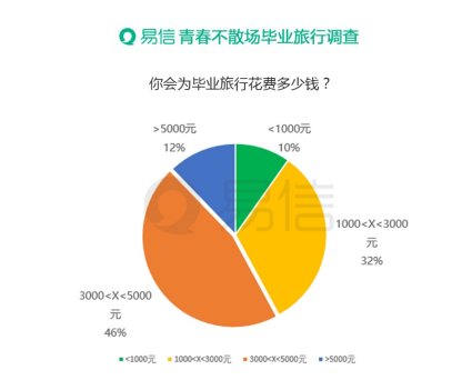 关于旅行花费,据易信不完全网络调查显示,45.7%的大学结业生旅行预算在3000到5000之间,预算在1000-3000元的人数占比也较大,达到32.3%,预算在5000元以上的占比为12.2%,另有9.8%的结业生更倾向“穷游”,旅游经费预算控制在1000元以下。