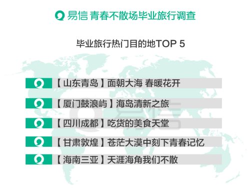 易信用户研究中心负责人体现,在站在人生节点上的年轻人眼中,昔日同窗好友即将各自天涯,旅行成为他们祭奠青春最好的途径,尤其是对于那些远途一直没有机会前往的目的地更是受到了结业生们的欢迎。