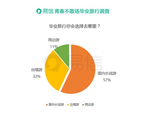 结业进行时,青春不散场,不少大学结业生决定牵手恋人、带着闺蜜来一场终生难忘的结业旅行。据易信网络调查数据显示,国内跨省长线游最受结业生青睐,占比高达57%,此外,32%的网友选择了出境游,,11%的易信网友选择周边短途作为结业旅行。