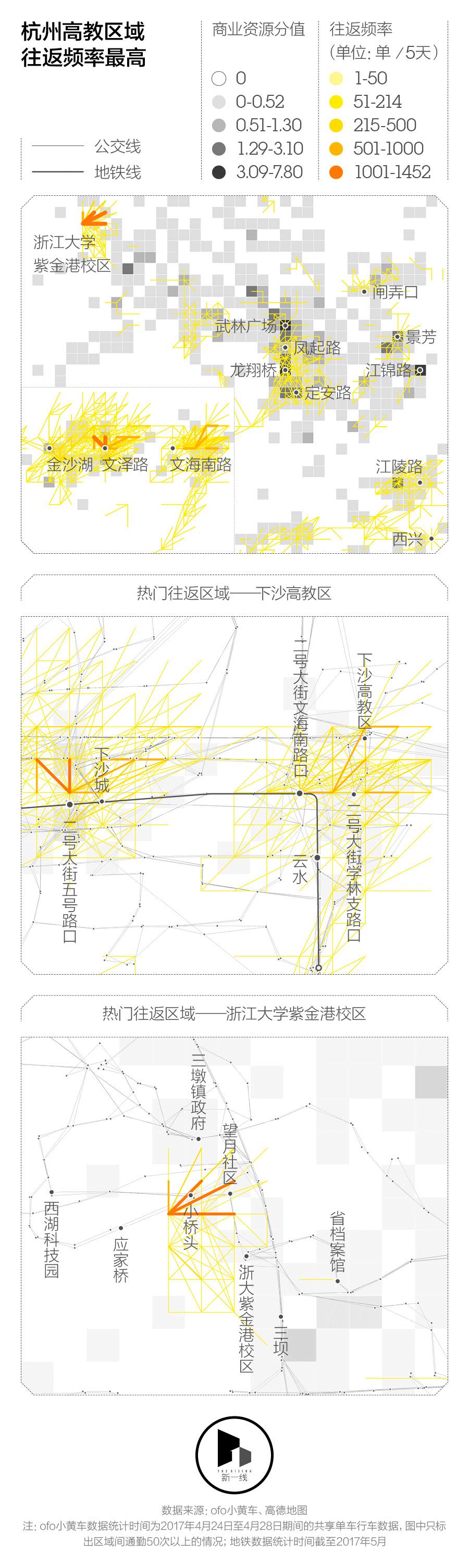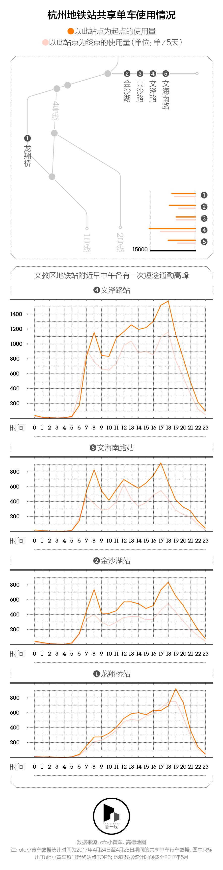 在杭州,平均每天有超过 5000 人骑着ofo小黄车到达地铁 1 号线的文泽路站。它是杭州ofo使用量最大的地铁站。在与文泽路相邻、都位于下沙高教区的文海南路站和金沙湖站,也都有明显的用车早晚高峰,中午时间也会有一个小高峰——这意味着午餐时间这里也有必然的单车出行需求。