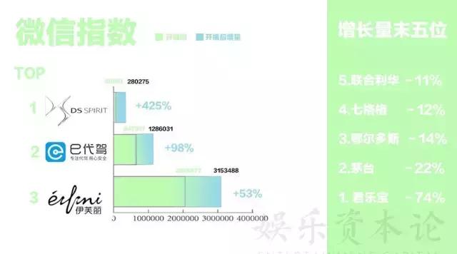 娱乐本钱论统计了36个植入品牌在《欢乐颂2》播出前后,百度指数、微博指数和微信推文量的变革,虽然他们并不反应销售额的变革,但他们在必然程度上反映了品牌植入在网络上的传播效果、话题效应。