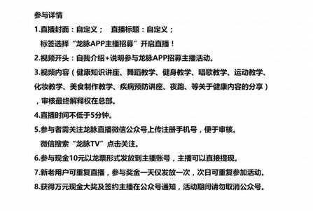 而你要做的是,下载我们的龙脉直播平台,注册登录,开始直播,保证直播时长超过五分钟,在直播开始做一个简单的自我介绍,并告诉我们是参与我们的招募主播活动即可;然后尽可能地展示本身,让我们看到你的特长和优势,以及成长的潜力。当然内容方面也给大家提供了很多的选择,健康知识讲座、舞蹈教学、运动教学、美食制作教学等等,不管你擅长哪方面,相信在这里总能找到一项合适本身的。