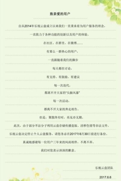 乐视云盘方面称,由于非法分子利用云盘存储传播盗版、淫秽色情等不法文件,乐视云盘决定停止个人云盘办事。