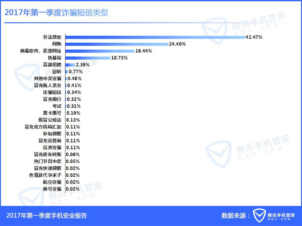 (图: 2017 年第一季度诈骗短信中,不法贷款占比高达42.47%)