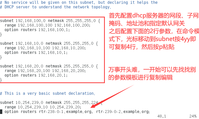 [root@xjj dhcp]# less dhcpd.conf ##查看配置文件并进行下一步编辑