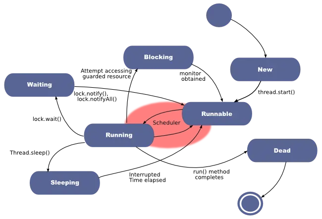 - Waiting指的是一个线程拿到了锁,但需等待其他线程执行某些操作。比如调用了Object.wait、Thread.join或LockSupport.park方法时,进入Waiting状态。前提是这个线程已经拿到锁了,并且在进入Waiting状态前,os层面会自动释放锁,当等待条件满足,外部调用了Object.notify或者LockSupport.unpark方法,线程会重新竞争锁,成功获得锁后才能进入到Runnable状态继续执行。