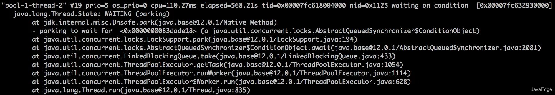 第4步用top -H -p pid命令看到的线程列表中还有许多名为“pool-1-thread-x”的线程,它们单个的CPU使用率不高,但是似乎数量比较多。你可能已经猜到,这些就是线程池中干活的线程。那剩下的CPU是不是被这些线程消耗了呢?