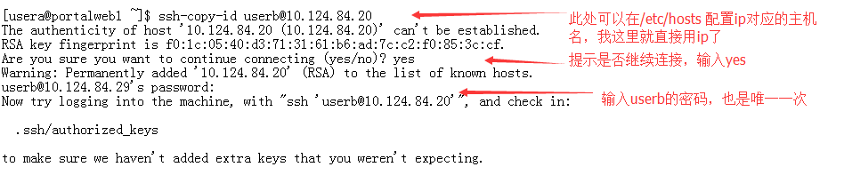 这个时候usera的公钥文件内容会追加写入到userb的 .ssh/authorized_keys 文件中