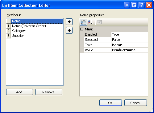 在SortableProducts Repeater上方添加一个DropDownList,将ID设为SortBy。在属性窗口里点Items属性打开ListItem集合编辑器。添加ListItems,让数据根据ProductName, CategoryName, SupplierName 字段排序。同时添加ListItem让product根据反向的name的顺序排序。