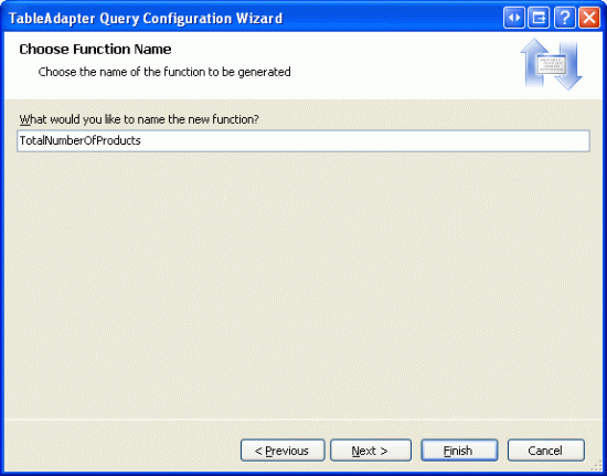 在下一个窗体我们可以指定创建哪种SQL .由于查询只返回一个值–Products表的总记录条数–我们选择“SELECT which returns a singe value”.