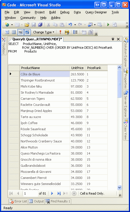 当使用OVER从句里的ORDER BY 列名(UnitPrice)来排级时,SQL Server会对结果排序.为了提升大数据量查询时的性能,可以为用来排序的列加上非聚集索引.更多的性能考虑参考Ranking Functions and Performance in SQL Server 2005.