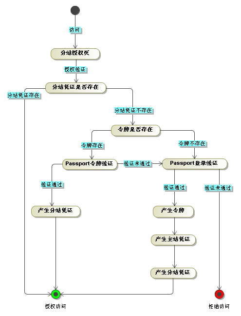 情形一、匿名用户:匿名用户访问分站a上的一个授权页面,首先跳转到主站让用户输入帐号、密码进行登录,验证通过后产生主站凭证,同时产生令牌,跳转回分站a,此时分站a检测到用户已持有令牌,于是用令牌再次去主站获取用户凭证,获取成功后允许用户访问该授权页面。同时产生分站a的本地凭证,当该用户需要再次验证时将先检查本地凭证,以减少网络交互。