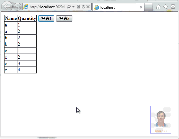 接下来,完成第二个报表,在Insus.NET使用Repeater包含Repeater来实现。因此,前台Html代码如下,其中第一个Repeate内放置了一个HiddenField,来存储名称(Name)字段,当作子Repeater的参考传入。