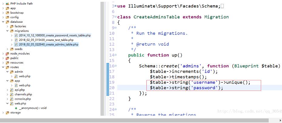 新创建了admins用户表,此用户表默认新建中只有主键,创建时间,编辑时间。我们接下来新加两个字段 用户名(username)
