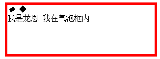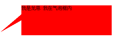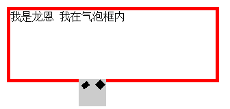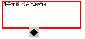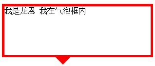 div class="longen"> div class="arrow"> em>#9670/em> span>#9670/span> /div> 我是龙恩 我在气泡框内/div> .longen{ width:300px; height:100px;position:relative; border:5px solid red; margin:50px auto 0;}.arrow{ position:absolute; width:40px; height:40px; left:100px; bottom:-40px;overflow:hidden;}.arrow *{position:absolute; font-size:40px; line-height:40px; width:40px; font-family:SimSun; font-style:normal; font-weight:normal; text-align:center; vertical-align:middle;}.arrow em{ color:red; top:-15px;}.arrow span{ color:#fff; top:-21px;}