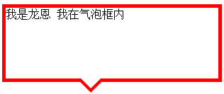 div class="longen">span>/span>我是龙恩 我在气泡框内/div> .longen {position:relative;width:300px;height:100px;border:5px solid red;} .longen span{position:absolute;left:100px;bottom:-40px;border-width:20px;border-style:solid dashed dashed; border-color:red transparent transparent;font-size:0; line-height:0;}