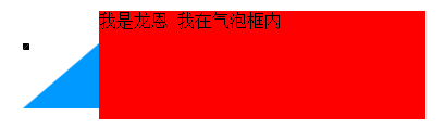 div class="longen"> div class="arrow"> em>/em> span>/span> /div> 我是龙恩 我在气泡框内/div>.longen {width:300px; height:100px;position:relative; background-color:red;margin:50px auto 0;}.arrow{ position:absolute; width:70px; height:60px; left:-70px; bottom:10px;}.arrow *{position:absolute; border-style:dashed solid solid dashed; font-size:0; line-height:0; }.arrow em{border-color:transparent #09F #09F transparent; border-width:30px 35px;} .arrow span{ border-width:20px 35px;border-color:transparent #FFF #FFF transparent; bottom:0;}
