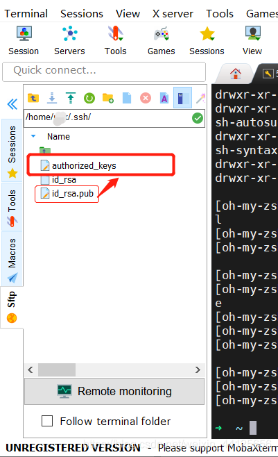 2.远程登录服务器,进入/home/user_name/.ssh/,将id_rsa.pub中的内容复制到authorized_keys中(如果没有,请自己创建),保存。(远程服务器上最终找到.ssh的路径可能有所不同,可以自己寻找)