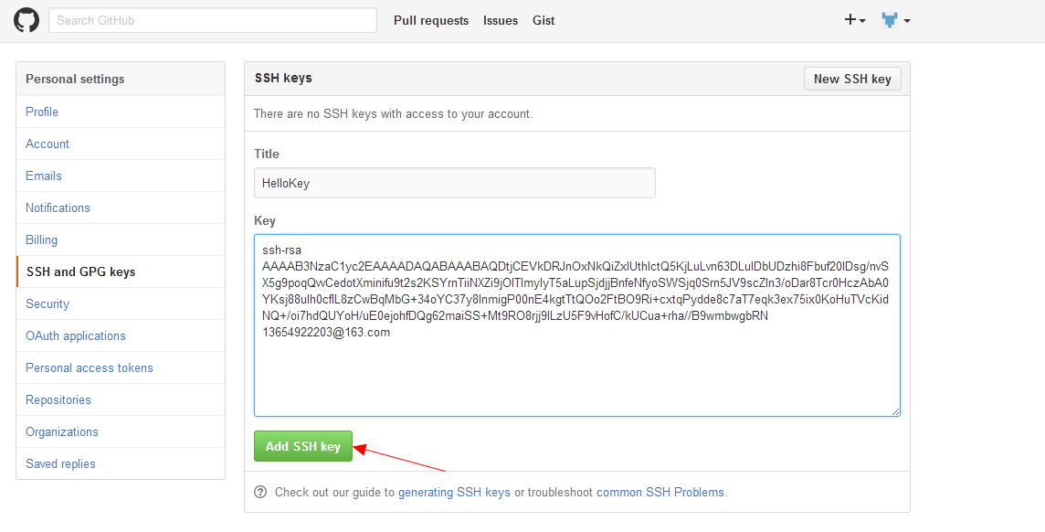 其中Title中的名称可以任意填写,将C:\Users\Administrator\.ssh目录下id_rsa.pub复制的所有内容粘贴到Key中,点击Add SSH Key,SSH密钥完成