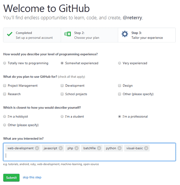 Github为了分析用户设置了几道问卷题,可以如实回答也可以随便填写。第一道题单选问你的经验如何,A:经验丰富 B:还凑和 C:完全新手 ;第二道题多选问你想用github做什么用,A:学校项目 B:开发 C:设计 D:研究 E:项目管理 F:其它;第三道题单选问你怎么描述自己 A:我是专业人员 B:我是业余爱好者 C:我是学生 D:其它 .第四道简答题,说一下你的兴趣。答完后点击绿色按钮,submit提交问卷。