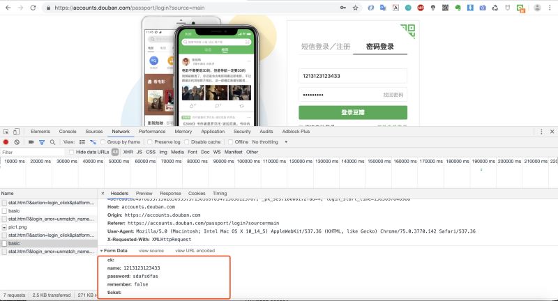 这里猪哥建议输入错误的密码,这样就不会因为页面跳转而捕捉不到请求!上面我们便获取到登录请求的URL:https://accounts.douban.com/j/mobile/login/basic