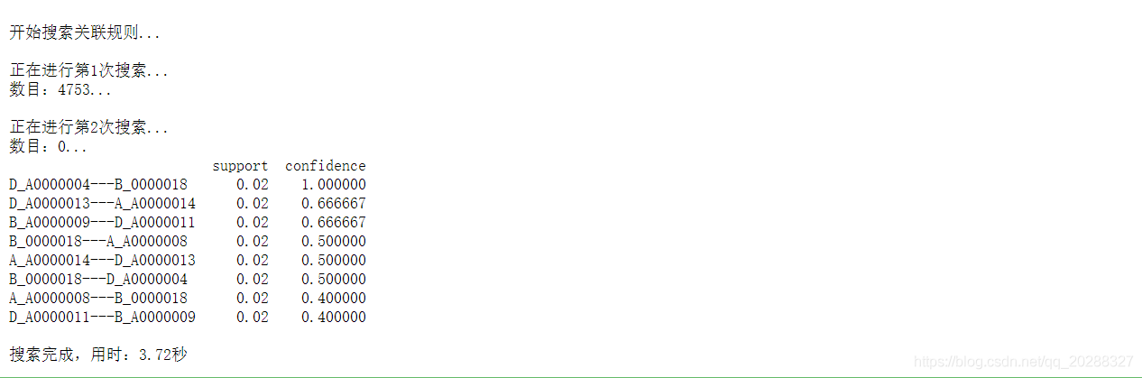 result = pd.DataFrame(index=['support', 'confidence']) # 定义输出结果