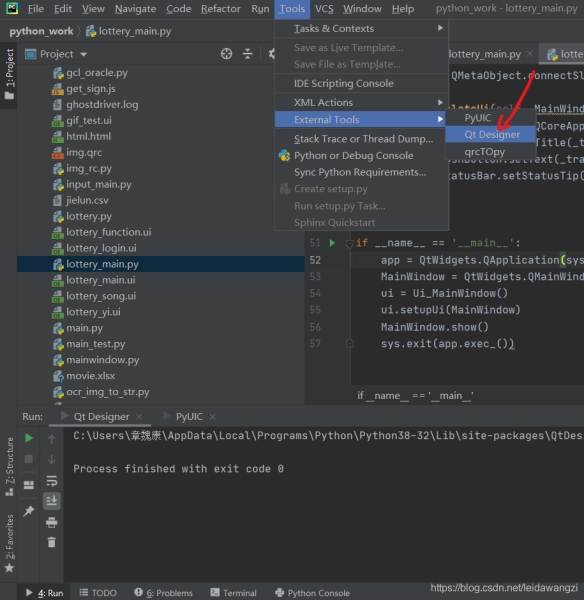 还记得我们在pycharm之前创建的exteranl tools吗?点击打开designer。